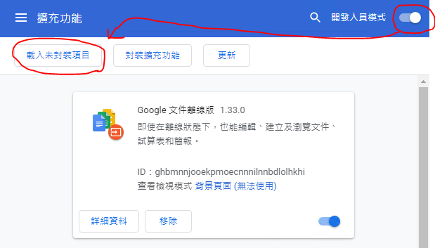 (2) 進入瀏覽器擴充功能頁面後點擊並開啟 「開發人員模式」(如下圖右上方)。