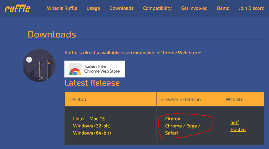 (1) 進入 https://ruffle.rs/#downloads 下載頁面 (如下圖),並下載瀏覽器的擴充功能壓縮檔(Browser Extension),